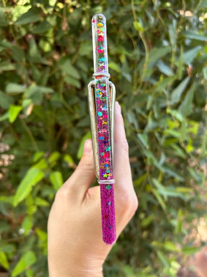 This Mini Aurascope is approximately 6 inches long. AuraScopes are our version of a kaleidoscope. This one has a mini glitter wand at the end that can be changed out for different colors. All three sides have a beautiful iridescent stained glass and are soldered together using lead-free solder.