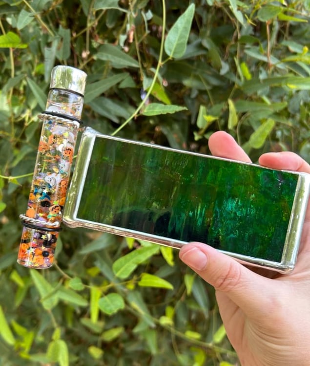 This Odyssey Scope is approximately 6.5 inches long. This one has a glass object chamber filled with food grade glycerin, glitter, beads, and little pumpkin and ghost inclusions. This scope comes with an extra vial that you can fill with whatever objects or beads you want. The glass vial is 30ml and approximately 4.75in from cap to bottom. All three sides of this kaleidoscope have a beautiful stained glass and are soldered together using lead-free solder.